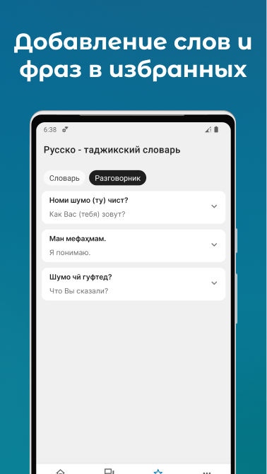 ✅ Hızlı kelime arama. Uygulama, Rusça veya Tacikçe istediğiniz kelimeyi veya kelime öbeğini hızlı bir şekilde bulmanızı sağlayan bir arama fonksiyonuna sahiptir.