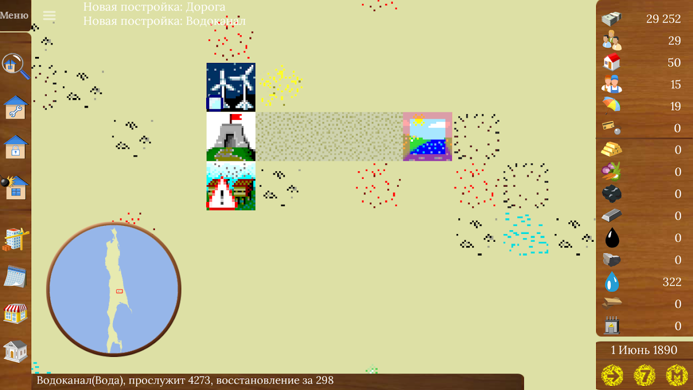 Вы можете создавать 33 вида строений.В некоторых клетках земли находятся определенные ресурсы (лес, вода, уголь и т.д.). Каждый день строения расходуют ресурсы и приносят прибыль. Некоторые строения могут работать только в определенные времена года.