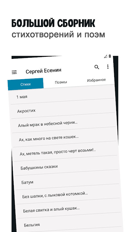 Şiir ve şiir koleksiyonu, Sergei Yesenin'in eserlerinde bulunan eşsiz atmosferle doludur. Rus şairlerin şiirlerini okumayı seviyorsanız bu uygulama tam size göre. Sergei Yesenin ve anlamı olan aşk, yaşam, ölüm, akrabalar ve arkadaşlar, doğa, hayvanlar ve çok daha fazlası hakkında internetsiz şiiri.