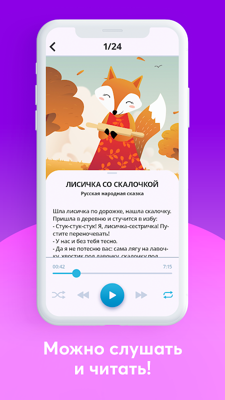 Это те самые сказки, которые читали нам наши мамы и бабушки. Теперь Вы можете познакомить и своего ребенка с этими полными мудрости сказочными историями. Традиционно эти сказки рассказывают на ночь, но Вы можете использовать их, чтобы занять своего малыша, например, в длинной поездкe. Все сказки сопровождены аудио, поэтому если Ваш ребенок пока не умеет читать, он может просто послушать сказку. Дети постарше могут слушать и следить за текстом, что на начальном этапе обучения улучшает навыки чтения. Так же мы подобрали для Вас несколько колыбельных, которые Вы сможете спеть своему малышу на ночь, и несколько классических мелодий, которые помогут ему успокоиться и заснуть.
