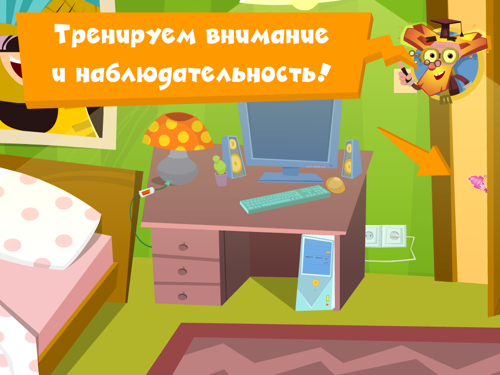 Крошечные существа – фиксики – появляются в неожиданных уголках комнаты и сразу исчезают. Нужно успеть запомнить, сколько раз выглянет фиксик – а затем выбрать правильный ответ из нескольких вариантов. Игра помогает тренировать наблюдательность, внимание и память – а малыши с ее помощью смогут изучить цифры и подготовиться к школе!