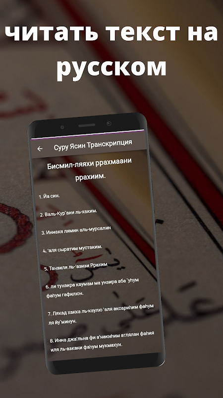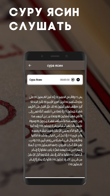 Bu uygulama sayesinde Yasin Suresi'ni dinleyebilir ve telefonunuza indirebilirsiniz.Yasin Suresi'nin Rusça yorumu da mevcuttur.