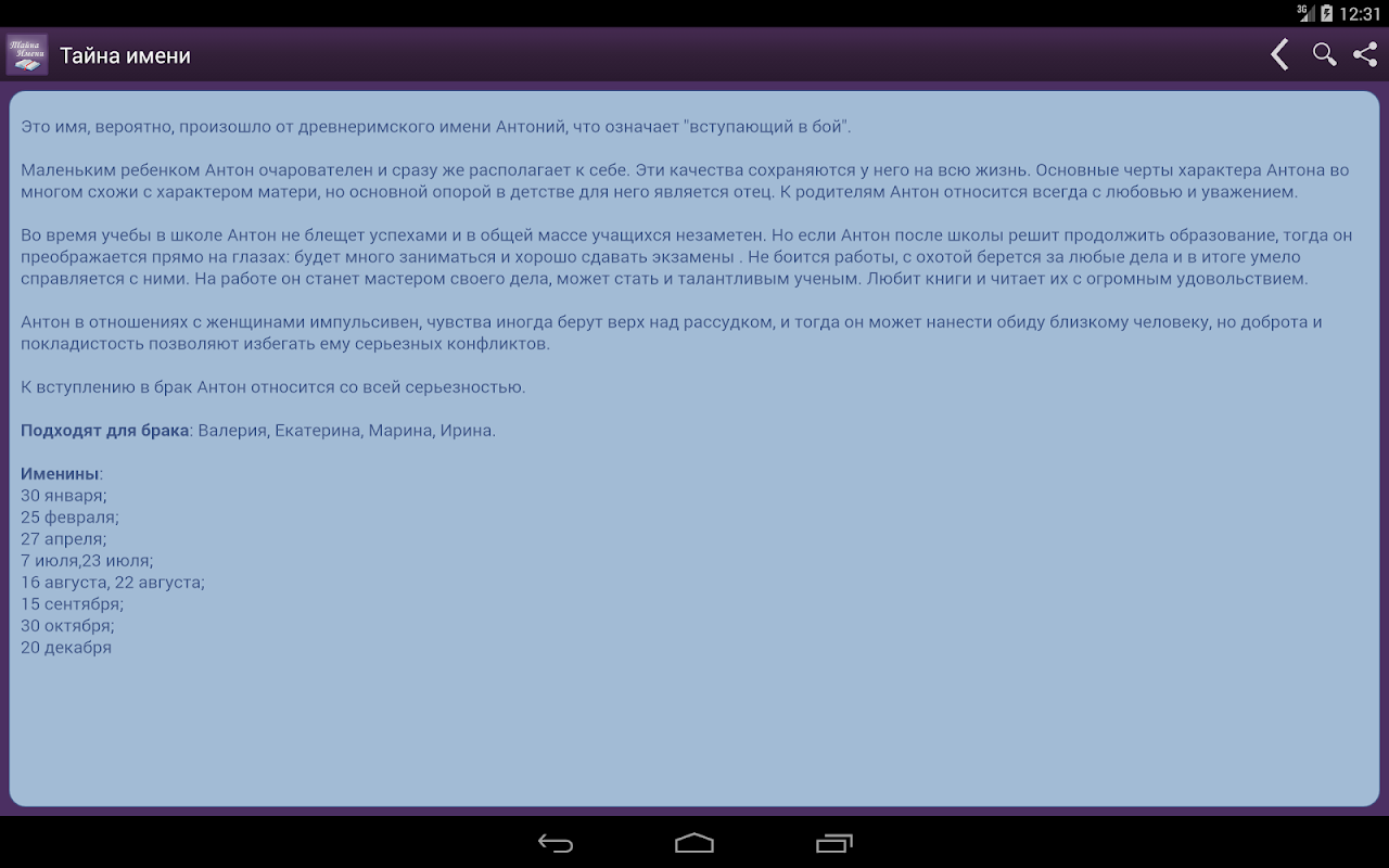 С помощью нашего приложения Вы можете узнать тайный смысл своего имени или подобрать наиболее подходящее имя для своего ребенка.