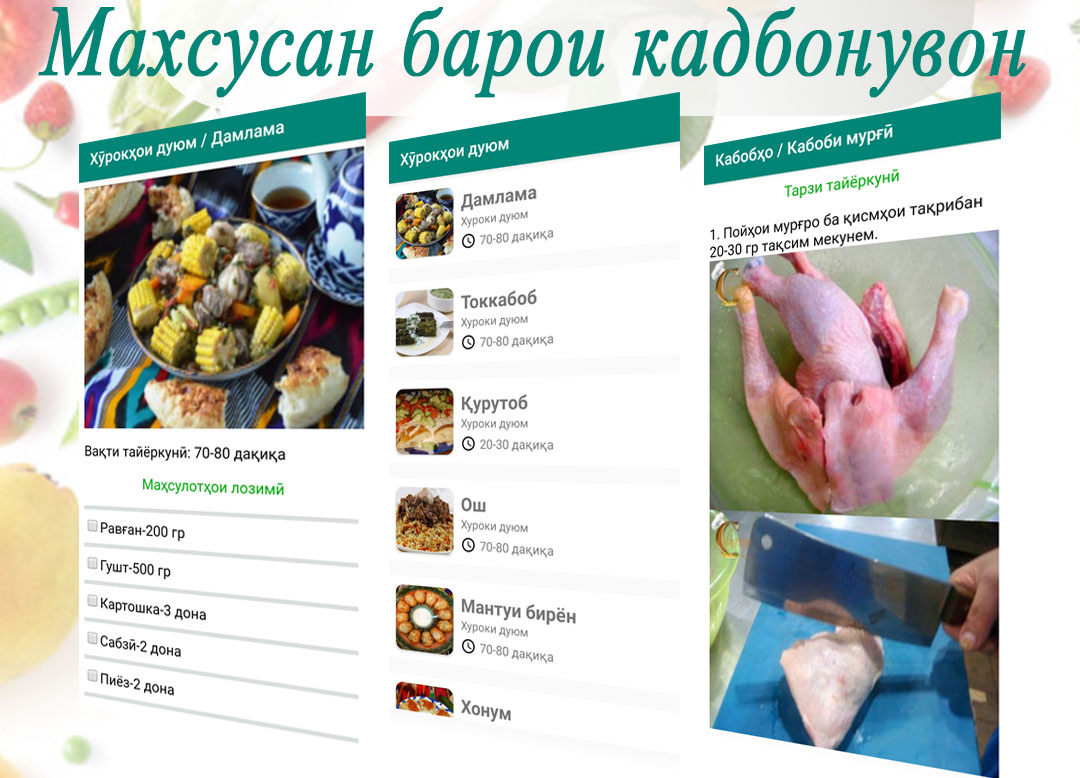 Taomҳoi bolazzati toҷikӣ az қabili osh, mantu, kabob, murabbo va ғ.