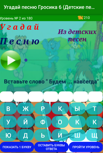 Угадай песню Гросика - это музыкальная викторина, в которой перед вам предстоит отвечать на музыкальные вопросы по мелодиям из Детских песен.
