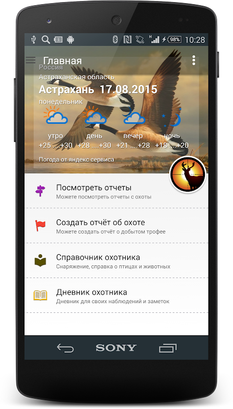 Приложение для истинных охотников, поможет не только отыскать место охоты на карте (каждое место на карте указано пользователями приложения, поэтому всё зависит от Вашего отчёта и добавления новых мест на карту), но и так же предусмотрено создание своего отчёта или отзыва о том месте охоты где в данный момент охотишься, или когда либо охотился. Так же данное приложение позволяет вести свой дневник наблюдений в зависимости от времени года, погоды, температуры и т.д. Данные о погоде сами подгружаются для места где именно находишься или можно их обновить с помощь предусмотренного функционала.