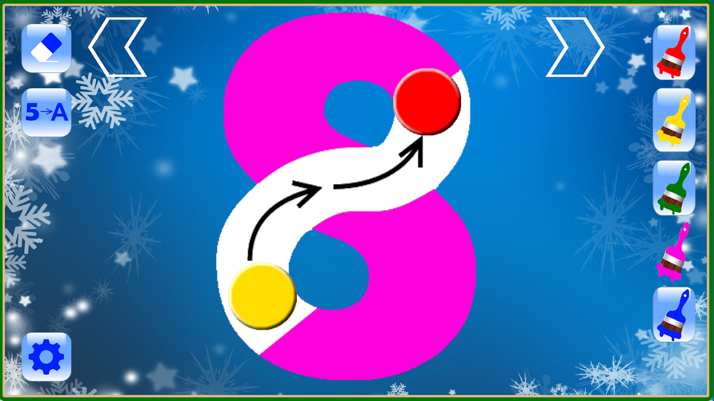 Oyun yüklendikten sonra, bütün ekranda ana ekranda büyük bir harf yazılır, böylece çocukların yazması kolay olur - ekranda bir parmak sürmek için. Bir elemanı boyamak için, bir parmağınızı ekrandan serbest bırakmadan sarı daireden ok yönünde kırmızı bir okla tutmanız gerekir; Bir elemanı başarıyla yazdıktan sonra, mektubun bir sonraki elemanı açılır. ve bütün mektup yazılana kadar devam eder. Harfler ve sayılar farklı renklerde yazılabilir, bunun için oyunda seçilebilecek farklı renklerde 5 fırça vardır. Mektubun üstünde sağda ve solda iki düğme vardır - oklar, üzerlerine tıklamak, harfi alfabetik olarak veya geriye doğru kaydırır. Ayrıca sayılarla sayı olarak azalır veya artar. Mektubun sol tarafında yukarıdan aşağıya doğru üç düğme bulunur: hepsini sil - boyayı harfin ve sayının tüm öğelerinden siler; Harfleri rakamlara çevirmek için butona basarsanız, üzerine tıklattığınızda, eğer harf varsa, o zaman rakamlara ve tersine çevirir, eğer sayılar yazarsanız harfleri olur; en düşük düğme ayarlardır Ayarlara girmek için düğmeye basın ve parmağınızı 3 saniye basılı tutun. Ayarlarda sesi tamamen kapatabilir, uygulamadan çıkabilir, tüm harfleri açabilir ve uygulamayı telefona bağlı sosyal ağlarında paylaşabilirsiniz.