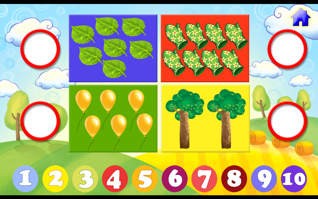 Если ребёнок найдёт 4 правильных ответа, он увидит новые 4 картинки с различными предметами и продолжит дальше тренироваться в счёте.