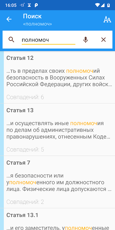 - Просмотр текста закона в виде удобного перелистывания статей, возможностью копирования выделенного фрагмента, поиска по тексту