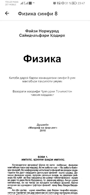 Dar barnom Kitobi Fizik 7. sınıf, Fizik 8. sınıf, Fizik 9. sınıf, Fizik 10. sınıf, Fizik 11. sınıf. Kitob baroi maktabbachagon va yo donishҷԯyon muvofiqat mekunad'da.