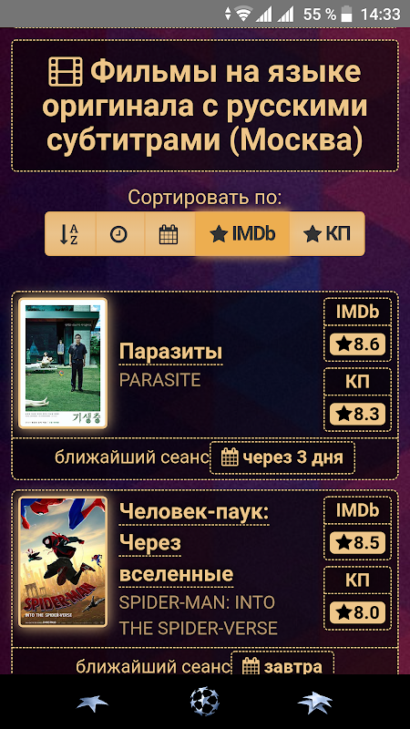 - сортировка фильмов на языке оригинала в Москве по названию, новизне, ближайшему сеансу, оценке IMDb, оценке КП;