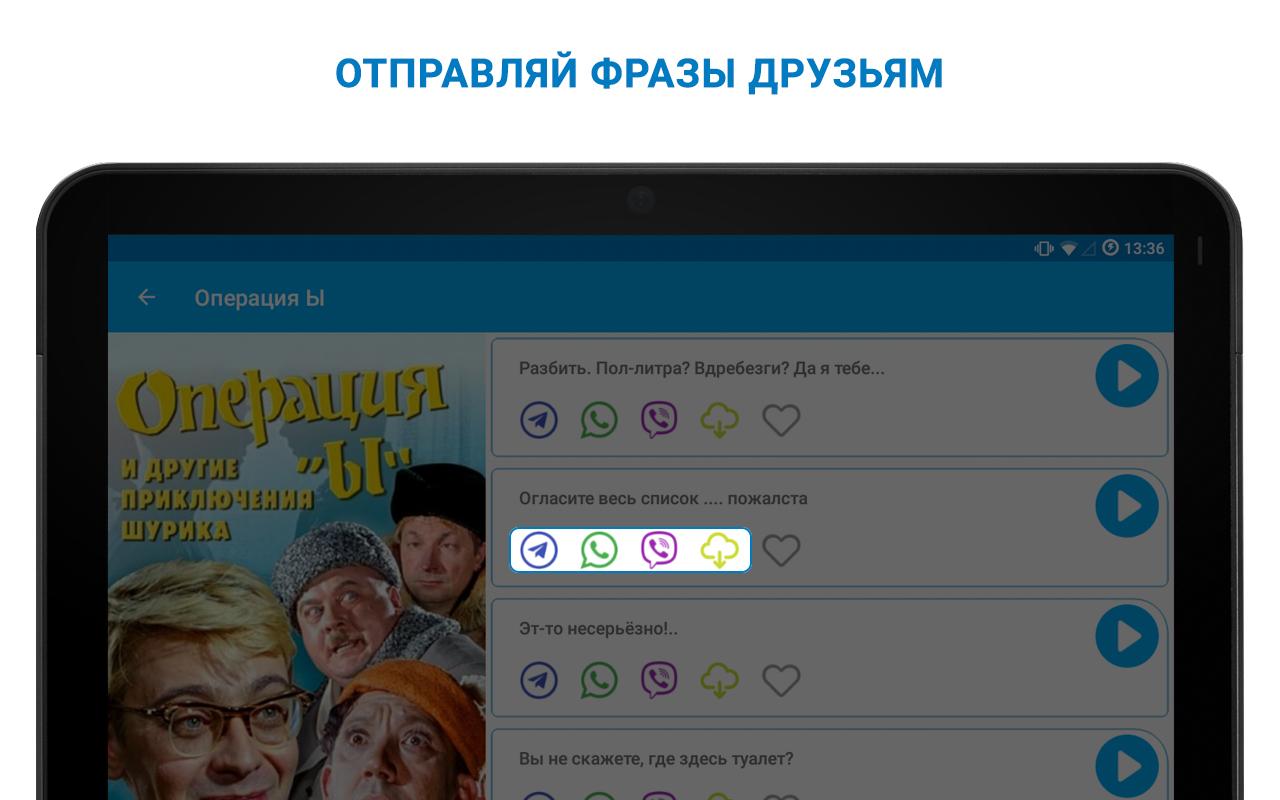 Alıntılar sürekli güncellenir, ki bu şüphesiz bir artı olarak adlandırılabilir. Bir zil sesine ihtiyacınız varsa, gelecekte uygulamaya eklenebilecek kendi sürümünüzü sunabilirsiniz. Buna ek olarak, tüm ifadeler mükemmel kalitededir, bu da yazarın çalışkanlığını doğrulamanızı sağlar. Ünlü alıntılar, çeşitli aforizmalar veya bilge düşünceler bu uygulamada kolayca bulunabilir. "Y Operasyonu" herkesin kendisinin sevdiği bir cümleyi bulacağı filmin harika bir örneğidir.