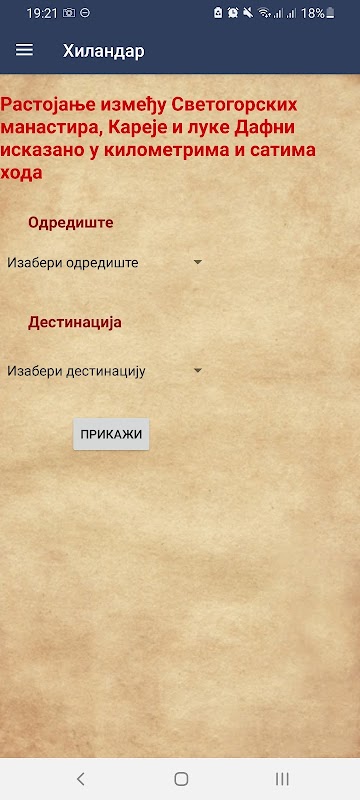 Burada kullanıcıya manastıra olan mesafeyi ve varış noktasından varış noktasına kaç saatlik yürüyüşle ulaşılacağını kolay ve hızlı bir şekilde belirleme fırsatı verilmektedir. Menüden basit bir seçimle hedef ve hedef seçilir ve göster düğmesine tıklanır. (Sveta Gora Atonska kitabından - Athos Dağı manastırlarının kilometrelerce ve yürüyüş saatleri olarak ifade edilen mesafelerinin tablosu).