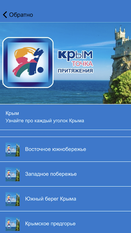 - узнать про каждый город Республики Крым, выбрав сначала направление, а потом и сам город. Вся информация будет постоянно обновляться и добавляться. Новые фотографии, видео-презентации городов и другая важная информация о каждом уголке Крыма;