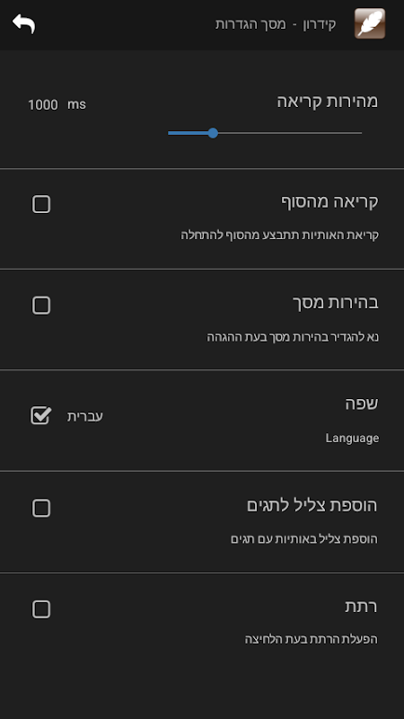 Ayrıca prova hızını 3 saniyeye kadar değiştirebilir ve böylece uygulamayı aslında mezuzah veya tefilin yazmak için kullanabilirsiniz.