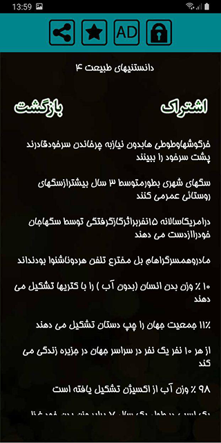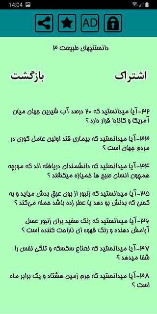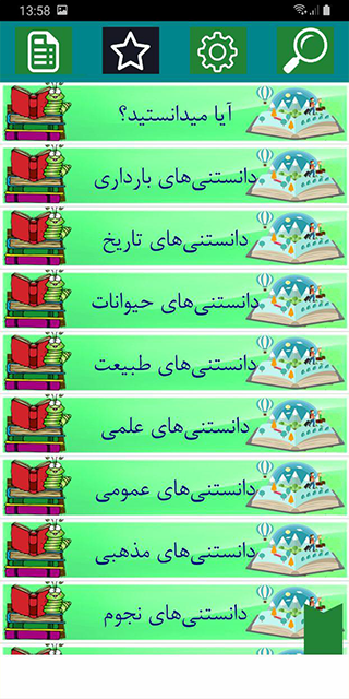 در این نرم افزار مجموعه ای از اطلاعات عمومی جالب و مفید گردآوری شده است که با مطالعه آن ها می توانید دانش خود را در زمینه های مختلف افزایش دهید.
