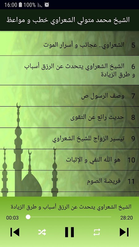 “Şeyh Muhammed Metwalli Al Sha’rawi vaazları ve vaazları” arayüzünde, genç veya yaşlı kullanıcıların problemlerden uzakta “Şeyh Muhammed Metwali Al Shaarawi vaazları ve vaazlarını” dinlemelerini sağlayan basit bir arayüz bulunmaktadır.