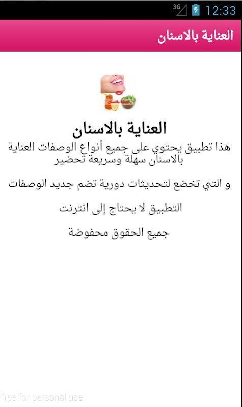 هذا تطبيق يجمع عدد من الوصفات تبييض الأسنان وعناية بالمعانيها وإشراقها ، لطالما بحتنا عن وصفات تبييض الأسنان ولكن هذه الوصفات غير فعالة و بدون أي نتدجا الحال أمامك فهذا التطبيق للحصول على إبتسامة مشرقة وبارخص التكاليف ودنا دهب إلى طبيب الأسنان .