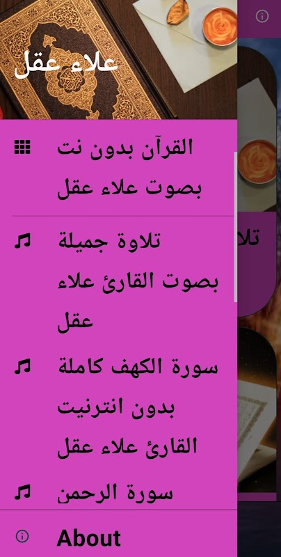Elinizde olan uygulama, Kur'an-ı Kerim'i ağ olmadan, Alaa Aql'ın sesiyle, tüm Kur'an-ı Kerim'de, internet olmadan okuyucu Alaa Aqel'in sesiyle içerir.