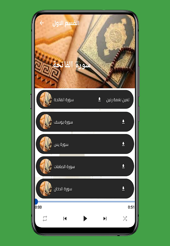 Uygulama, Kur'an-ı Kerim'i yüksek kalitede okuyan Şeyh Muhammed Al-Barrak mp3'ünün sesiyle içerir.