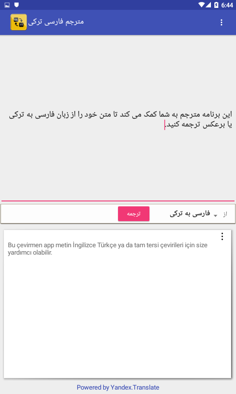این برنامه مترجم به شما کمک می کند تا متن خود را از زبان فارسی به ترکی - ترکیه ای یا برعکس ترجمه کنید.
