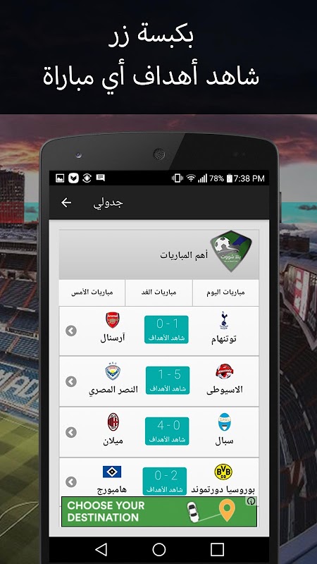 بنقرة زر احصل على جدول مباريات اليوم \ الأمس \ الغد أو أي يوم آخر . بالاضافة الى أهداف و ملخصات المباريات HD مجانا