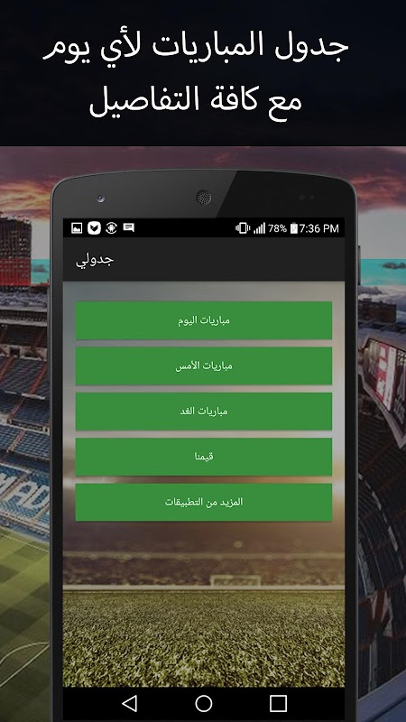 ✔✔ تطبيق جدولي هو تطبيق مجاني يوفر لك جدول المباريات لأي يوم مع كافة التفاصيل (التوقيت حسب بلدك، القنوات الناقلة، المعلق، الملعب، التشكيلة الأساسية ...) مع أهداف و ملخصات جميع المباريات HD و بالتعليق العربي 👌