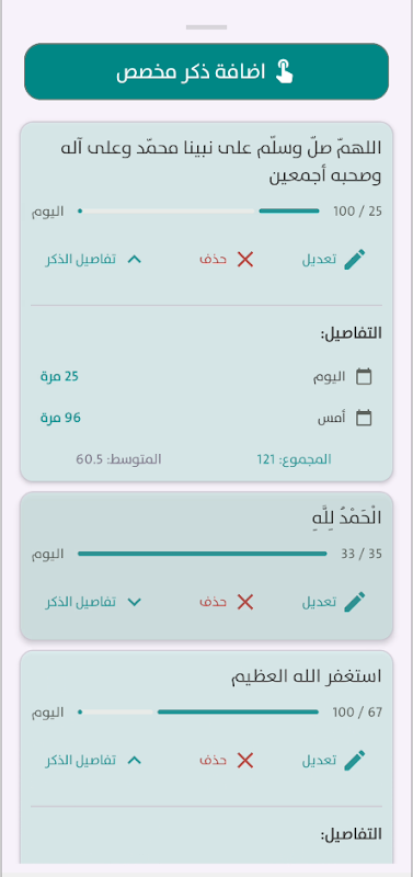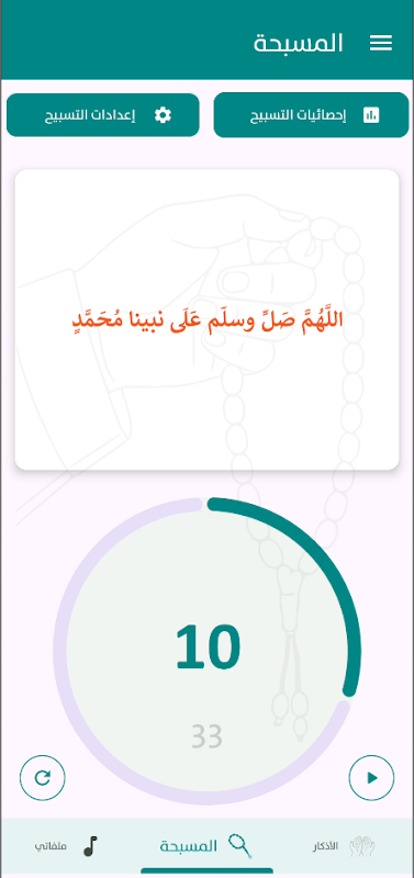 اضافة شاشة المسبحة مع ميزات التحكم بعدد الاذكار واضافة اذكار مخصصة