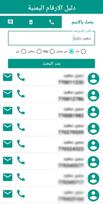 Tüm Yemenli telekom şirketleri (Yemen Mobile, MTN (YOU), Sabafon, Y ve sabit hat) için milyonlarca numara içerir.