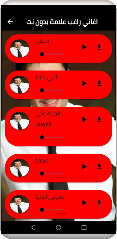 تطبيق اغاني راغب علامة هو تطبيق يحمل اغاني راغب علامة بدون نت.يتميز التطبيق بخلفية رائعة و تصفح سريع حيث يمكنك الاستماء إلى جميع اغاني راغب علامة بدون نت.
