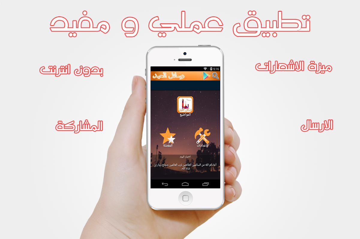 حمل تطبيق صور رسائل تهنئة عيد اضحى 2016 علي جوالك وأحصل علي أجمل بطاقات وصور التهنئة بمناسبة عيد الأضحي المبارك ممكن تكون خلفية لجوالك أو رسالة لصديق أو مشاركة علي الفيس بوك أو تويتر، و التطبيق شامل لأاجمل رسائل معايدة باللغة العربية و الانجليزية، به أفضل صور و رسائل التهنئة قصيرة و طويلة متنوعة، فهو بمثابة كاتالوغ صور و بطاقات يتيح لك حرية الاختيار، لأن به مجموعة كبيرة جدا و متنوعة لأجمل رسائل و صور تهنئة و مباركة عيد أضحى.