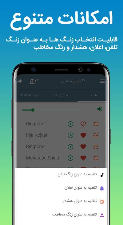 - دارای چهار بخش زنگ تلفن ، زنگ اعلان، زنگ ساعت و لیست علاقه مندی های شما