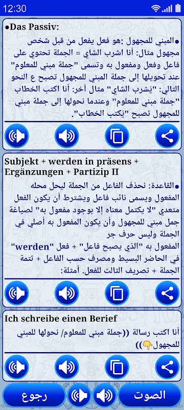 يدعم التطبيق ميزة "تحويل النص إلى كلام" وبالتالي يمكنك تعلم الألمانية بالصوت, وأيضاً يتضمن خاصية الإشعارات "Notifications" والشاشات المصغرة "Widgets" والتي تعرض في كل يوم جملة جديدة.