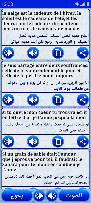 يدعم التطبيق ميزة "تحويل النص إلى كلام" وبالتالي يمكنك تعلم الفرنسية بالصوت, وأيضاً يتضمن خاصية الإشعارات "Notifications" والشاشات المصغرة "Widgets" والتي تعرض في كل يوم جملة جديدة.