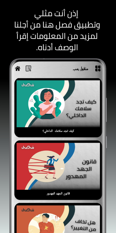 - يتيح لك فصل القراءة في التصنيفات الآتية: التطوير الذاتي والروحي، علاقات وتواصل، المال والأعمال، والأسرة وعلم النفس، الفلسفة والعقل، الفقه الإسلامي، قصص وتجارب وجاري العمل على إتاحة المزيد بإذن الله.