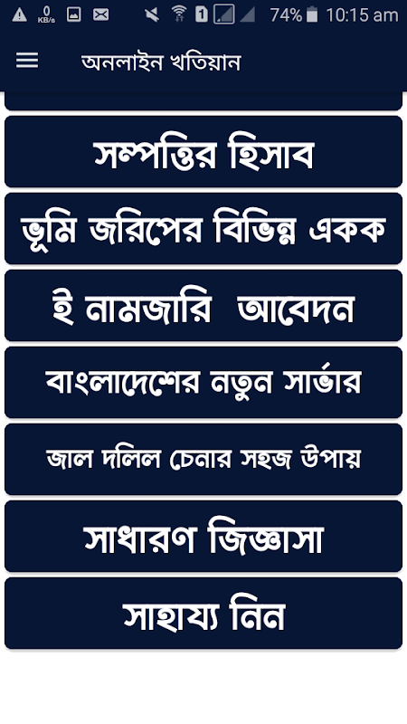 আমাদের এই এ্যপটি বাংলাদেশের সকল জমির খতিয়ান বের করে দিবে। আপনি শুধু আপনার খতিয়ানের নাম্বার অথবা সংশিষ্ট মৌজার দাগ নাম্বার দিবেন, বিস্তারিত খতিয়ান চলে আসবে। ঘরে বসে আপনার ভূমির খতিয়ানের সকল তথ্য পেতে এই এপটি ব্যবহার করুন, একই সাথে এই এপে পাবেন নামজারী বা নাম খারিজ, নামজারির অপশন।