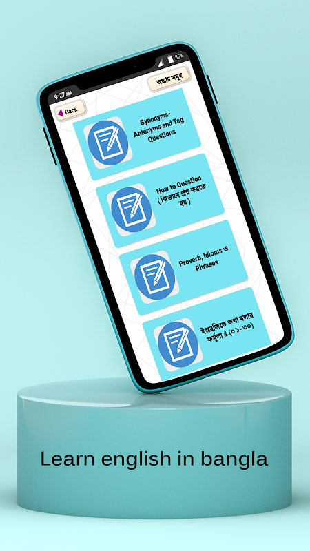 Bu uygulama, örneğin İngilizce Dilbilgisi öğrenmenize yardımcı olacaktır. Alfabe, Cümle, Makaleler এবং Makaleler এর ব্যবহার, Zaman, Edat, Uygun Edat, Cümle Tamamlama- এর নিয়মাবলী, Fiillerin Doğru Biçimi, Cümlenin Dönüşümü, Ses Değişimi, Anlatım, Derece ve Derece Değişimi- এর নিয়মাবলী, Zamir Referansı, Noktalama İşaretleri , Cümle Bağlaçları, Bazı Özel Sözcüklerin veya Deyimlerin Kullanımları, İngilizce Dersi-Değiştiriciler, Eşanlamlılar-Zıtlıklar ve Etiket Soruları, Nasıl Sorgulanır (কিভাবে প্রশ্ন করতে হয়), Atasözü, Deyimler ও İfadeler, ইংরেজিতে কথা বলার ফর্মুলা, স্পোকেন ইংলিশ, İngilizce Kelime Kelime Listeleri, Konuşma da.