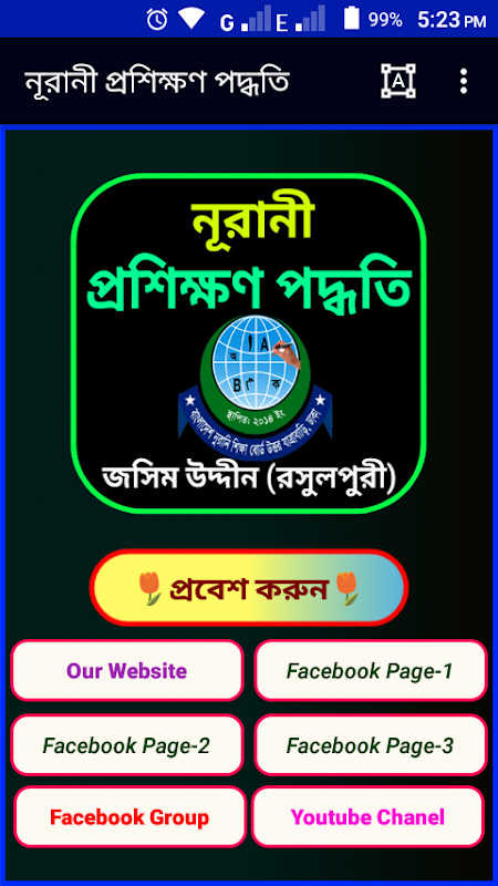 প্রিয় মুয়াল্লিম ভাইয়েরা আপনাদের সকলের খেদমতে বাংলাদেশ নূরানী শিক্ষাবোর্ড উত্তর যাত্রাবাড়ি, ঢাকা এর অধিনে নূরানী প্রশিক্ষণ পদ্ধতি(শিক্ষক প্রশিক্ষক জসিম উদ্দিন রসুলপুরী) এ্য আকারে প্রকাশ করা হলো। আশা করি সবাই অত্যন্ত আনন্দিত হবেন এবং অনেক অনেক উপকৃত হবেন। সকলের দোয়া এবং আমাদের এ্যাপটিতে অবশ্যয়ই আপনাদের মূল্যবান কমেন্ট এবং রেটিং কামনা করছি।