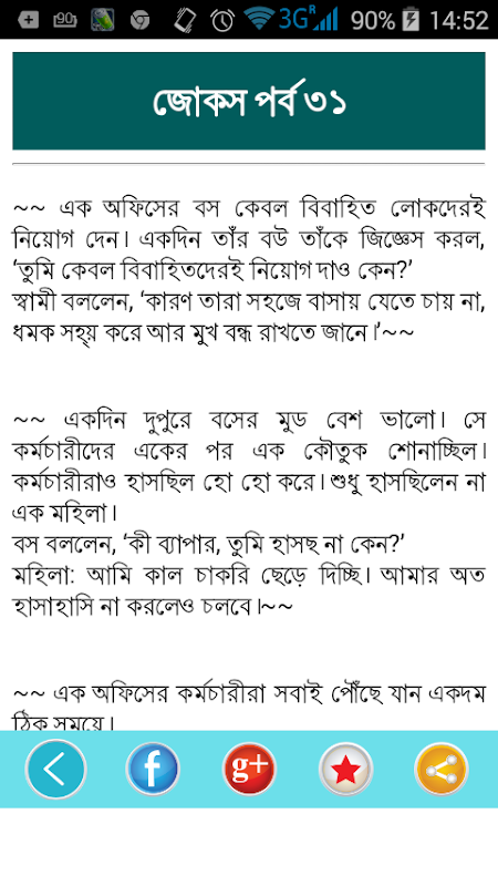 আমাদের এই bangla jokes app টিতে রয়েছে সোশ্যাল শেয়ারিং অপশন এতে করে আপনি এইসব মজার মজার কৌতুক ও হাসির বক্স গুলোকে ফেসবুক স্ট্যাটাস (facebook status )হিসাবে শেয়ার করতে পারবেন আপনাদের বন্ধুদের সাথে ।
