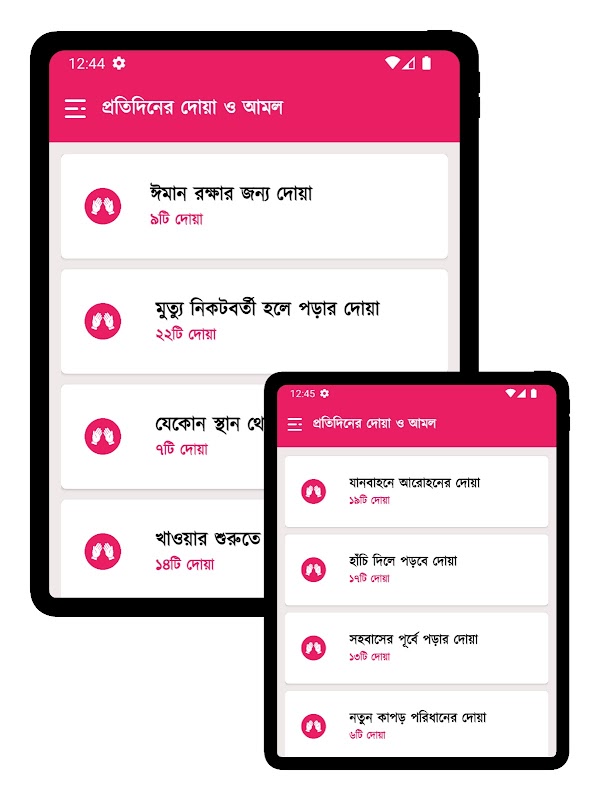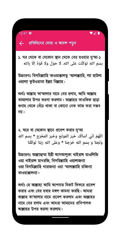 Bengalce Telaffuz ve Bengalce Anlamı ile birlikte Arapça ile düzenlenmiş Günlük Temel Duas. Bu uygulama sabah ve akşam namazlarını ve amellerini içerir. Allah'tan hidayet istemek için dua, dünya ve ahiretin genel refahı için dua, anne-baba ve çocuklar için dua, tehlike, felaket ve kıtlıktan korunmak için dua, hastalıklardan ve ruhsal sorunlardan kurtulmak için dua. Tuvalete girmeden önce okunacak dua, uyumadan önce okunacak dua, hapşırırken okunacak dua, camiye girerken okunacak dua. Ayrıca Kur'an-ı Kerim'de anlatılan Rukiye ayetleri ve hadislerde anlatılan Rukiye Duaları, namaz sırasında okunacak dualar ve namazdan sonra okunacak dualar da bulunmaktadır. Sayyedul Istighfar, Darood Sharif, Kalima, Kunute Najela, Munajate Maqbool günlük yaşamımızda ezberlememiz ve düzenli olarak okumamız gereken tüm gerekli duaları içerir.