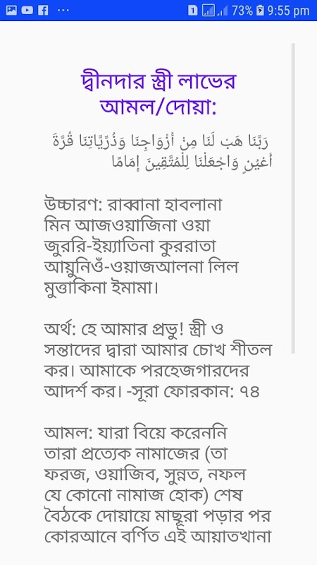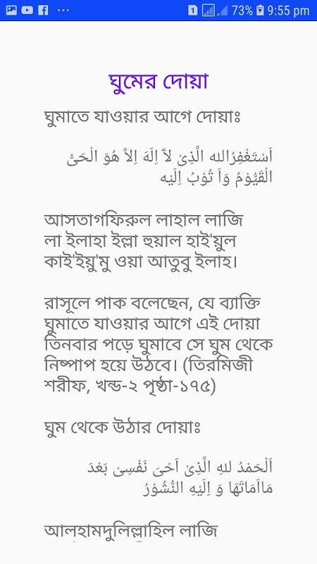 Günlük dua uygulaması Arapça telaffuz, Bengalce anlamı ve erdemleri ile düzenlenmiştir. İşte tehlikeden kurtuluştan dindar bir eş edinmeye ve kişinin yaşama süresini arttırma sürecine kadar tüm gerekli dualar ve eylemler.