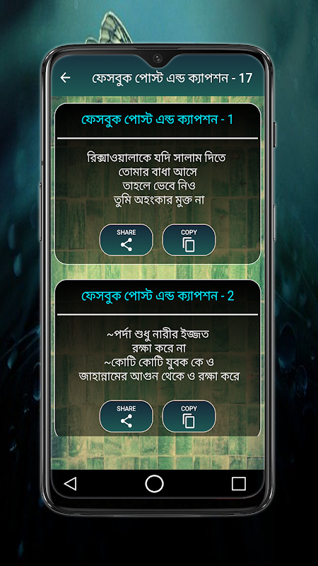 এই এপটিতে পাবেন আপনি অনেক রকমের ক্যাপশন । যেখান থেকে অনায়াসে নিজের পছন্দ মত ক্যাপশন বাছাই করে কপি করে পোস্ট করে দিতে পারবেন । এপটিতে আছে কপি করার সুন্দর অপশন, সাথে এপের সাইজ ও খুবই কম।
