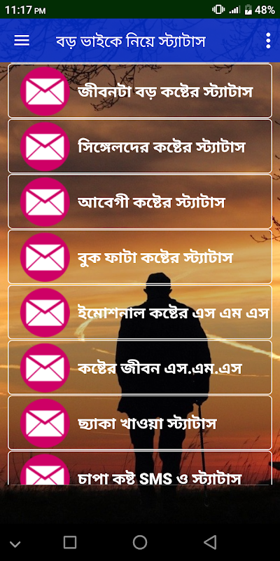 এই অ্যাপটি তৈরি করা হয়েছে পরিবারের সকল বড় ছেলেদের কষ্টের কথা প্রকাশ করার জন্য। বড় ভাইকে নিয়ে স্ট্যাটাস নতুন নতুন কষ্টের বাছাই করা এসএমএস কালেকশন আমাদের এই অ্যাপটিতে। পরিবারের সকল বড় ভাইদের প্রতি শ্রদ্ধা ও সালাম রেখে দুঃখ কষ্ট নিয়ে বাংলা এস এম এস অ্যাপসটি লেখা হলো । আশা করি সবার ভালো লাগবে।