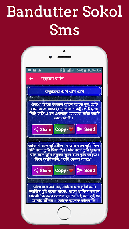 সবাইকে আন্তরিক ভাবে ধন্যবাদ। প্রথমেই আমার সালাম গ্রহন করবেন। আমাদের অ্যাপের মধ্যে আপনি বন্ধুত্বের সকল এসএমএস খুব সহজেই পেয়ে যাবেন। প্রতিটি এস এম এস "Share""COPY""Send" এই তিনটি পর্যায়ে আপনি আপনার মনের মানুষকে পাঠাতে পারবেন।শুধু আপনাদের সুবিদার্থে আমার অক্লান্ত পরিশ্রমের ফলশ্রুতিতে এই অ্যাপটি বানানো।