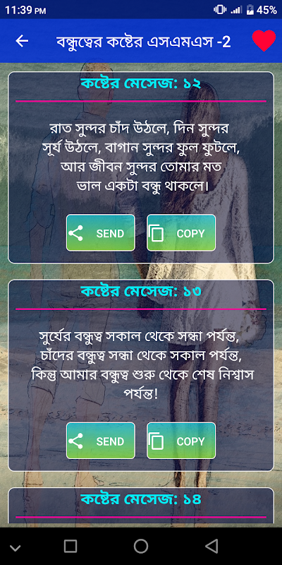 আমাদের অ্যাপের মধ্যে আপনি বন্ধুত্বের বন্ধুত্বের সকল এসএমএস খুব সহজেই পেয়ে যাবেন। প্রতিটি এস এম এস COPY ও Send করতে পারবেন। আপনি আপনার মনের মানুষকে পাঠাতে পারবেন।শুধু আপনাদের সুবিদার্থে আমার অক্লান্ত পরিশ্রমের ফলশ্রুতিতে এই অ্যাপটি বানানো।
