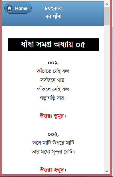 আমাদের এই অ্যাপটি মোটামোটি এক হাজারের মত ধাঁধা এবং ঝটপট প্রশ্নের উত্তর নিয়ে ডেভেলপ করা হয়েছে। এটি খুব সহজভাবে সাজানো হয়েছে। এই অ্যাপটি আশা করি ব্যবহারকারীদের জন্য অনেক গুরুত্বপুর্ন একটি অ্যাপ হবে এবং তদের অনেক উপকারে আসবে।