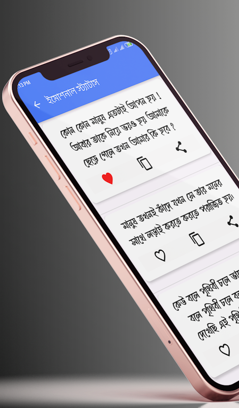 En son ve en etkileyici Bangla durum güncellemeleri, alıntılar ve mesajlar için nihai varış noktanız olan Bangla Durumuna hoş geldiniz. İster duygularınızı paylaşmak, ister özel anları kutlamak, ister sadece sevdiklerinizle bağlantıda kalmak istiyor olun, uygulamamız size her durum için mükemmel olan çok çeşitli Bangla metin içeriği sunar.