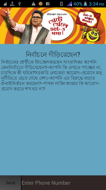 মীরাক্কেল অসাম সালা বাংলা Joke’s. হাসাইতে হাসাইতে মাইরা ফালাইবো এই স্লোগানে Zee-বাংলায় সপ্রচারিত সর্বাধিক জনপ্রিয় মীরাক্কেল আক্কেল চ্যালেন্জার অনুষ্ঠান থেকে Joke’s গুলো সংগ্রহ করে এই Application টি প্রস্তুত করা হয়েছে। Joke’s গুলো সম্পূর্ণ Free এবং Offline Based.