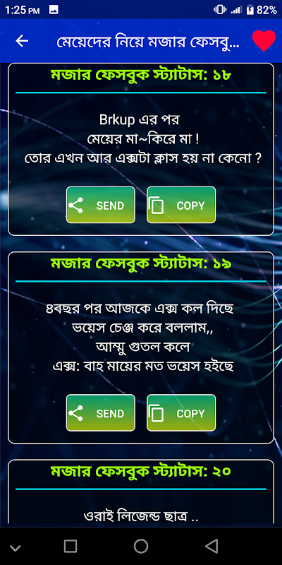 মেয়েদের নিয়ে মজার ফেবুক স্ট্যাটাস। আমরা আমাদের ভালোলাগা থেকে শুরু করে সকল বিষয়াদি ফেবুক স্টাটাস এর মাধ্যমে সেয়ার করি। ফেবুকে মেয়েদের নিয়ে মজার স্টাটাস দিয়ে আমরা আমাদের মনের ভাব গুলোকে প্রকাশ করি সবার মাঝে। আপনাদের কথা চিন্তা করে আমাদের এই বারের আয়োজন মেয়েদের নিয়ে ফেবুক স্ট্যাটাস অ্যাপটি।