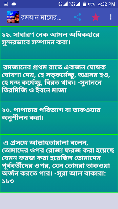 মাহে রমজান ২০২১ অ্যাপসটিতে তুলে ধরা হয়েছে রমজান মাসের আমল, দোয়া, ঈদ ও কুরবানি সহ গুরুত্বপূর্ন বিষয়। ইসলামের ৫টি মূল ভিত্তি কলেমা,সালাত(নামায)সওম(রোযা),যাকত,হজ্ব। রোযা তন্মধ্য ৩য়।একজন মুসলমানকে অবশ্যই এর উপর প্রতিষ্ঠিত হতে হবে। আল্লাহ তার বান্দাদেরকে সুসংবাদ দিয়েছেন(প্রতিশ্রুতি) দিয়েছেন রমযানের রোজার পুরস্কার আমি নিজে দিব।তাই সঠিকভাবে পালন করতে হলে জানতে হবে রোযার ফজিলত ও রোযার নিয়্যত এছাড়া ইফতারের দোয়া সহ তারাবি নামাজের নিয়ত এবং তারাবিহ নামায পরার নিয়ম ও দুরুদ শরিফ তাছাড়া নামাযের দোয়া ও তারাবিহ মোনাজাত সহ রোজা ভঙ্গের কারন সমুহ রোযার কাফফারা কিভাবে দিবে তাছাড়া যে কারনে রোযা ক্বাযা ওয়াজিব হয়ে যায় রোযার সম্পর্কে মাকরুহ কিভাবে হয় ,যে দিবসে রোযা রাখা হারাম,যে কারনে রোযা ভঙ্গ করাযায়,রোযার আমল,দোয়া।এছাড়াও শবে ক্বদর,শবে বরাত,ঈদুল ফিতর,ঈদুল আজহা,শবে কদর এর নামাজ ও দোয়া,শবেকদর, লাইলাতুল কদর,কোরবানির মাসয়ালা সহ ছোট বড় অনেক আমল যার ফায়দা অনেক বেশি। এগুলি এ অ্যাপসটিতে তুলে ধরা হয়েছে।